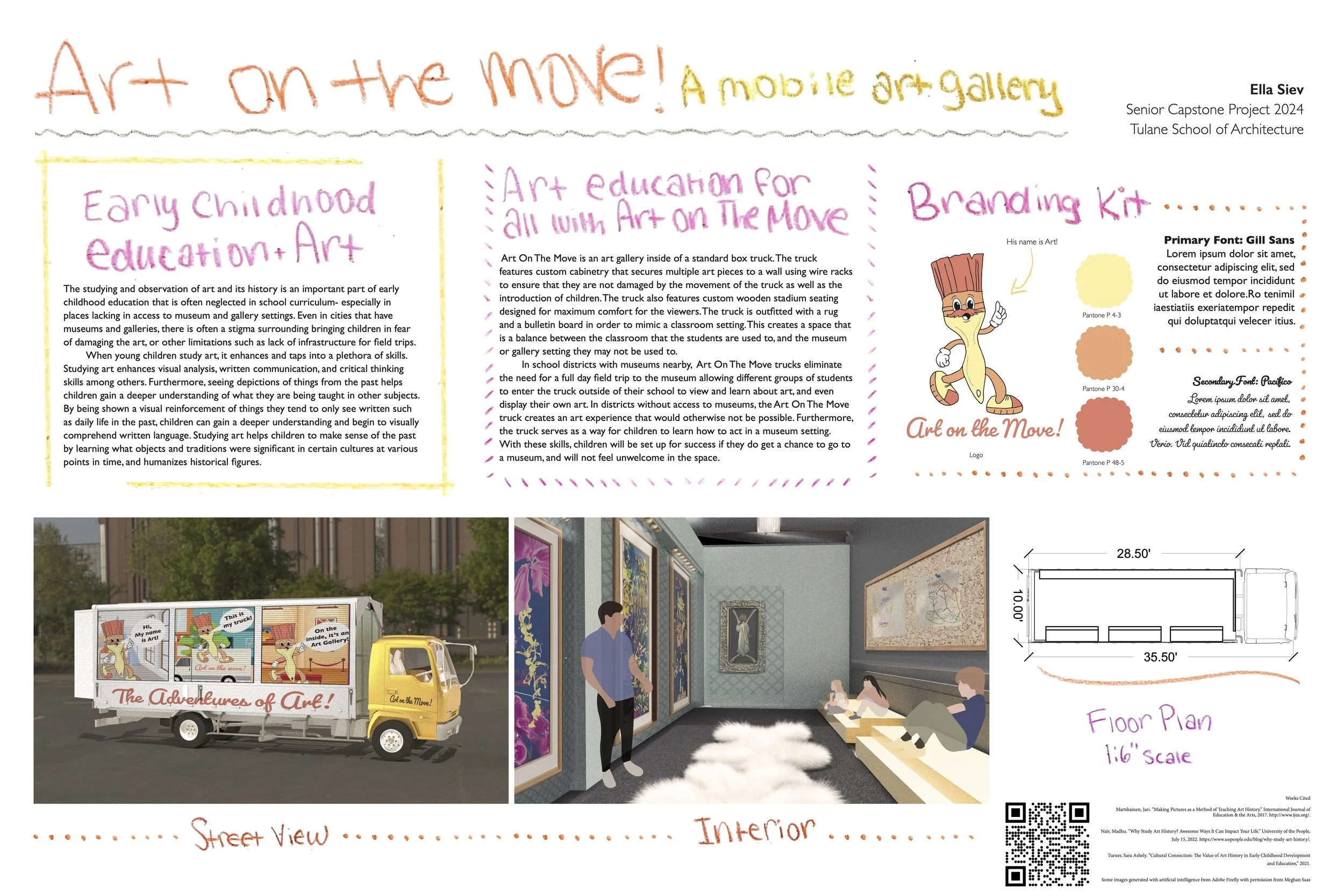 The senior capstone project at Tulane School of Architecture is meant to serve as a culmination of ones education by combining design with other disciplines. My capstone explores the intersection of design, art history, and early childhood education. This project was fully designed, researched, and developed over the course of the final semester at Tulane. Art On The Move is a mobile art gallery designed to bring art education to all.