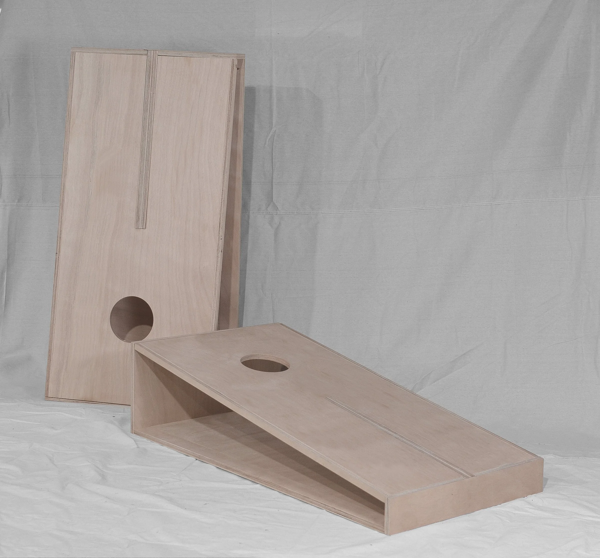 The purpose of this assignment was to create a port-manteau piece of furniture that has dual functionality. The corn hole companion table was created with the idea of maximizing outdoor space. The design is comprised of two regulation sized corn hole boards that are fully functional for game play, and even have a built in catcher for the bean bags. When stacked together, the two boards create a seamless coffee table with a sleek design on on the side, and its cornhole function becomes unnoticeable. This piece eliminates the need for a bulky, unattractive cornhole set while simultaneously solving the problem of having to move a coffee table in order for gameplay.